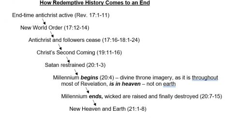 - The millennium follows (Revelation 20:4-6), with the imagery of judicial proceedings related to heavenly thrones. In 14 places in John’s Revelation, throne(s) are alluded to and all are located in heaven. This is the apocalyptic imagery that was begun in Revelation 1:4 related to God’s throne. The only allusions to any other thrones are those of Satan (2:13) and of the beast (13:2, 16:11).